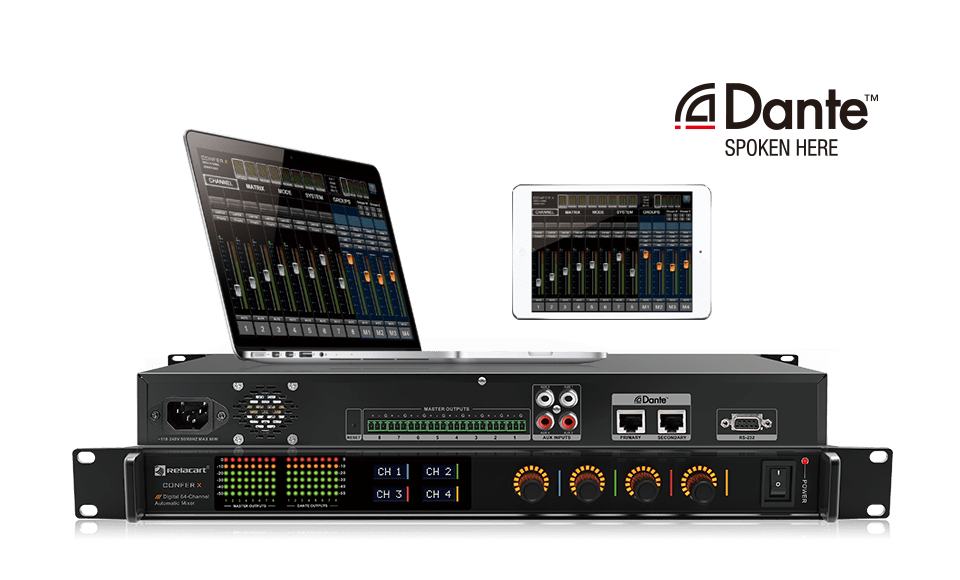 力卡团队与客户多次交流后,决定采用均支持Dante协议的Relacart CONFER X有线数字64通道自动混音器与Block 4Dante 转换盒和20只TDN-1Dante网络有线麦克风。