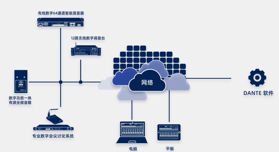 另外还有Relacart·力卡多年研发的Dante整体生态架构,囊括麦克风、智能混音器、会议系统、音响等,轻松就能组建一套优质的音频系统,并能随意进行扩展,以便适用于不同场合使用。