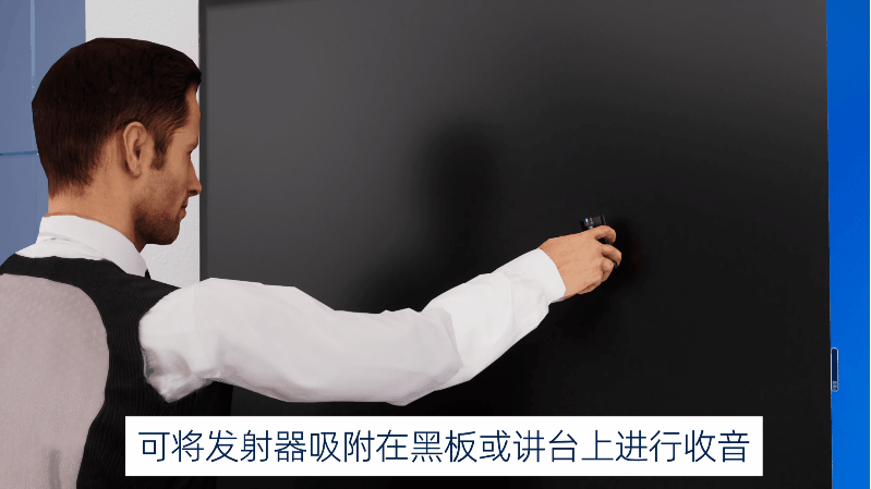 发射器方面,IMIC-6除了配备带有控制上下翻页功能、激光指示功能的激光笔以外,麦克风也采用了极其玲珑小巧的设计,背部带有独特的磁吸软夹,即能夹在衣领上使用,也能吸附到黑板或其他金属上,摇身一变成为固定式麦克风。