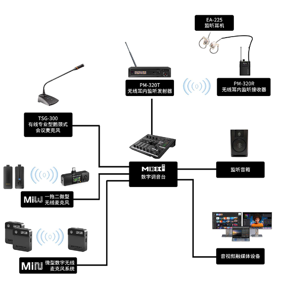 Relacart·力卡推出的校园电视台音频系统解决方案,拾音部分由TSG-300有线专业型鹅颈式会议麦克风、MI2微型数字无线麦克风系统、MI3一拖二微型无线麦克风组成,可满足课程录制、在线教育、节目拍摄、演播室等拾音需求。