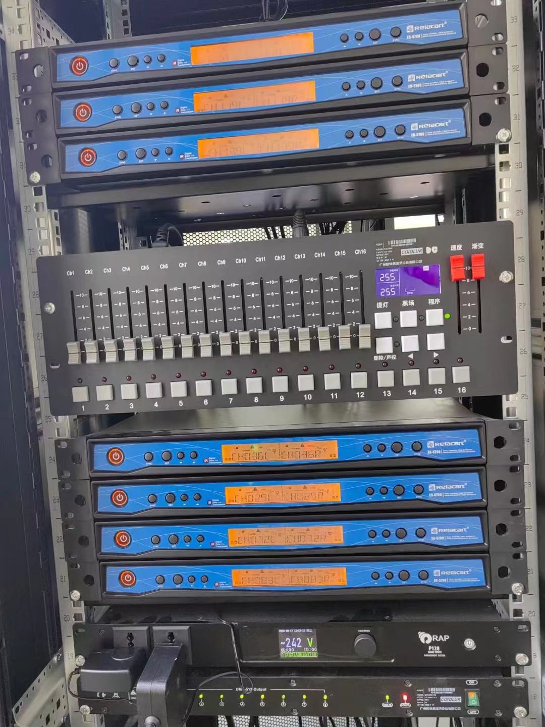 为了应对舞台部分区域存在信号传输盲区和山区里恶劣的环境,决定使用R-32AU全频天线和R-14D天线分配器来对舞台进行全面信号覆盖。传统的天线面对雨雪等恶劣天气有可能会出现生锈和使用寿命减短等多种情况,并且在射频环境干扰严重的区域可能会影响,而R-32AU宽频指向性天线采用了结实耐用的金属打造具有一定的防水和侵蚀功能,能够户外恶劣天气中持续为演出提供信号扩大功能,并利用心形指向性的前端灵敏度高,后方弱和线性单一指向的原理可以有效抑制后方的干扰信号。以2组32AU全频天线每组120度°角(指向角度为左右120°;上下180°)经过R-12S天线集线器并联到R-14D天线分配器组成天放系统(R-12S天线集线器可以将1个射频信号分成2个或者2个射频信号合成1个;注:射频增益会有一定的衰减)。
