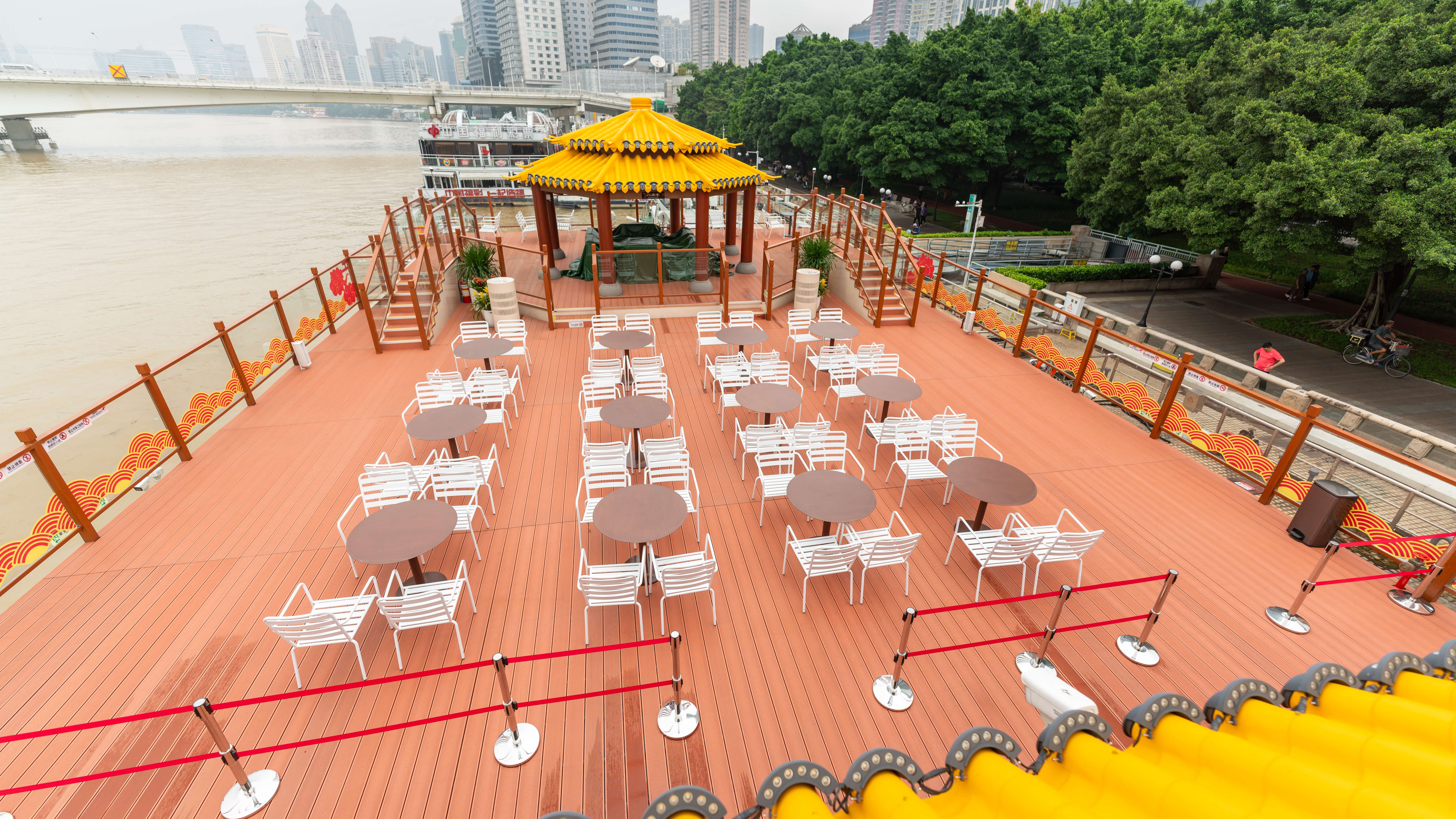“金禧号”是珠江夜游的新能源游轮之一,整体设计将中式风格与岭南文化结合,仿佛一座水上古典庭院。2024年2月2号晚,“金禧”号在广州大沙头码头成功首航。