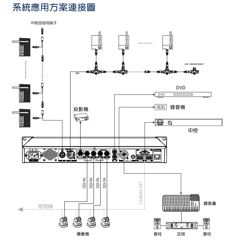 具有4个视频输入和1个视频输出端口,支持标清和高清SDI视像输入输出,高清SDI支持HDcctv1.0、HD-SDI(ST292)、3G-SDI(ST424)、SD-SDI(259)等标准。