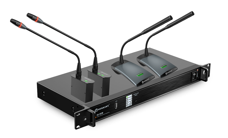 CS-102是一款简单、经济的讨论音频会议系统。 CS-102M中央控制器是整个系统的控制中心,包括会议模式选择、外输出扩声电平、线路输入功能等。系统可连接45个麦克风单元,具有语音输入自动增益、啸叫抑制、 先进先出和语音控制功能; 可外接功放扩声; 可直接安装在EIA标准1U机架上,搭配10米连接线,具有辅助音频信号输入输出功能,方便连接其他设备。