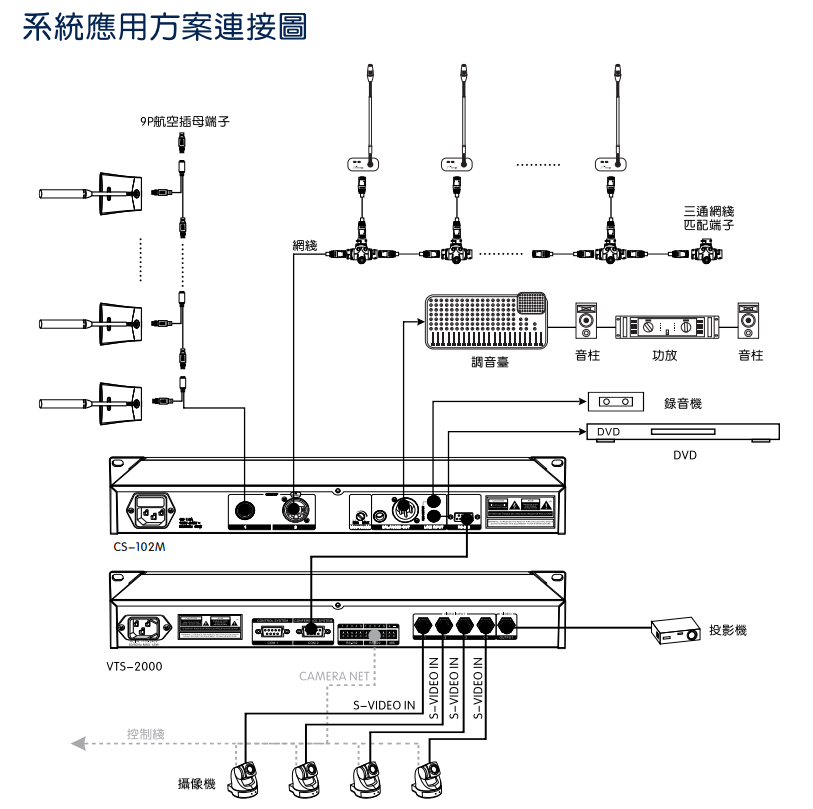 具备录音输出连接录音机,所有会议记录功能完全录音保存,还可以外接音频扩声设备。可以连接VTS-2000摄像跟踪控制主机,实现摄像会议。