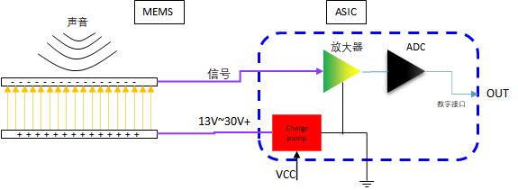 例如,数字麦克风的结构如下图所示。与模拟麦克风不同,数字麦克风在输出前加入了模数转换器(ADC),用于采集声压并将其转换为输出电压。