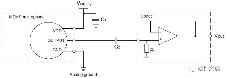 对于单端输出的模拟硅麦克风,常规应用电路如下: