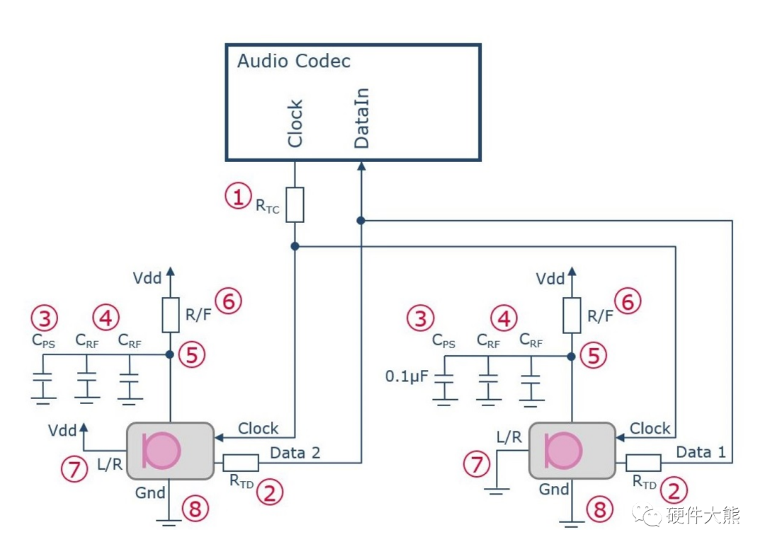 PDM格式的数字硅麦克风通常具有5个引脚,包括VCC、CLK、Data、L/R和GND。在电路应用中,只需按照麦克风的输入输出引脚定义,将其连接到编解码器或应用处理器(AP)的输入/输出接口即可。对于多麦克风阵列的应用,通常两个麦克风会共享一个Data线,并且将它们的L/R引脚分别连接到高电平和低电平。如下图所示: