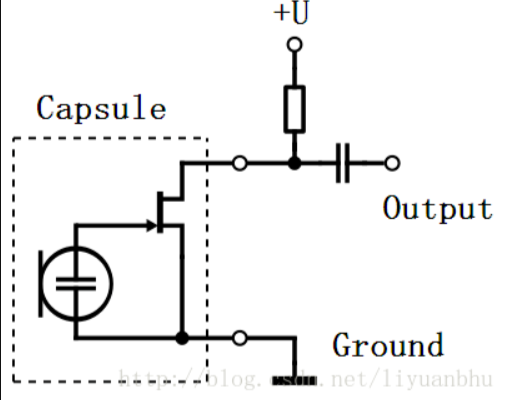 这些驻极体电容器麦克风通常在内部集成了一个场效应管(FET)。电容的一侧连接到了FET的栅极,如下图所示: