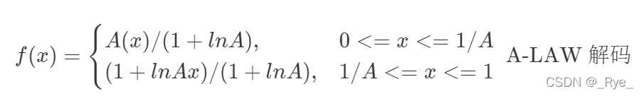 比如,G.711 中的 A-LAW 就是采用非线性量化的方式对每个采样点进行压缩。而在这里用 8bit 量化的采样点表示就可以比 16bit 的少一半的数据量。在图 1 的语音时域信号里可以发现,大部分信号的幅度都在比较低的范围内,只有少部分的幅度值会比较大。如果给予更多的精度用于描述低幅度的信号,那么压缩后,听感上的损失就会比较小。比如下面 A-LAW 公式中就是通过固定值 1/A 作为区分幅度大小的的界限,用非线性的对数 ln 来划分表达的幅度位置,对高、低幅度分别用不同的量化精度对采样点进行量化。
