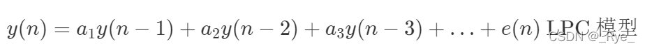 再联想一下前面介绍语音信号分析时,我们发啊、哦、额的时候,口型是不是不一样的。因此,在语音的建模中,模拟声道建模的线性预测滤波器就可以派上用处了。线性滤波器的系数(LPC)反映的是各个声道器官的状态。而在 10~30ms 时间内器官移动的距离有限,所以可以认为声道器官的位置基本不变化,这样就可以利用线性滤波器来对语音进行编码。而线性滤波器的系数远比时域对应帧的采样点个数要少很多,比如一般用 16 阶的 LPC 就可以来表示一个 10ms、16kHz 采样的 160 点的帧。LPC 的公式如下所示,可以看到这是一个自回归的模型,即当前值是过去值的加权预测。