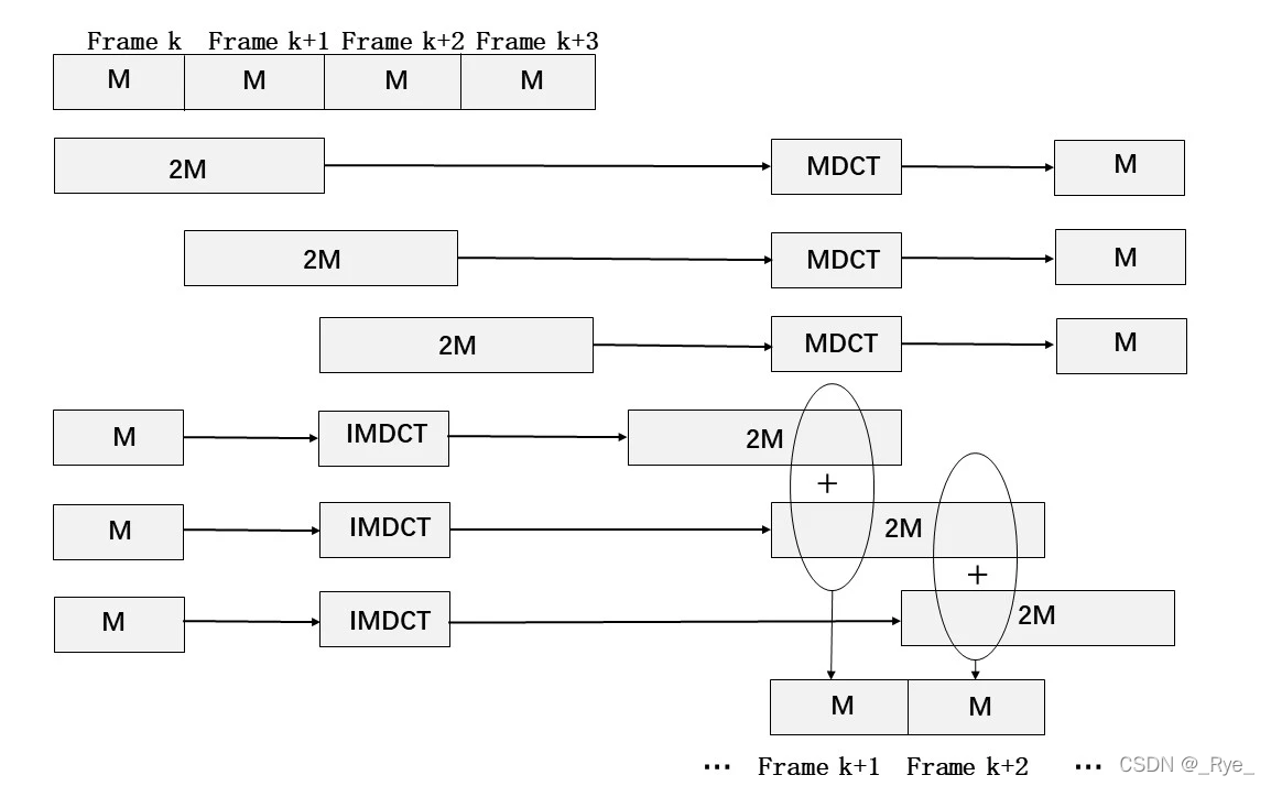 MDCT 编码主要过程是分帧,然后一次有重叠的取几帧(比如图 3 是一次取 2 帧)做 MDCT 变换得到一个编码信息。解码时,每个编码信息通过 IMDCT 逆变换还原编码的那几帧的信号,然后再通过滑动叠加的方式得到还原的音频信号。