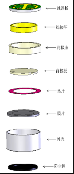 镀金属层薄膜与背极板形成空气介质电容。对驻极体充电形成电场,E=Q/C。声波使薄膜振动,改变电容量和电场,产生电信号,△E = Q /△C。