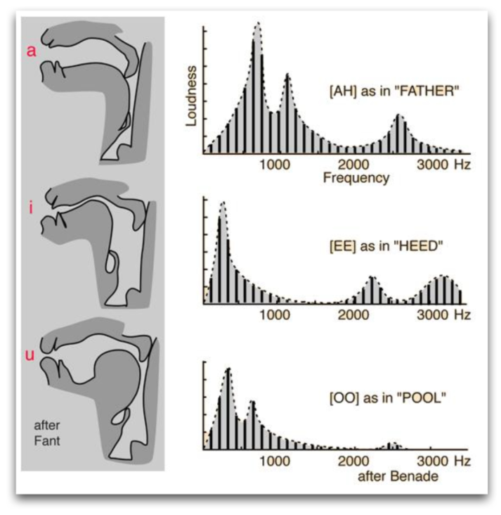 声带振动产生的基波在声道中反复碰撞反射,形成谐波,其频率是基频的整数倍。谐波在频谱图中表现为浊音能量集中的地方,呈现为栅格状的形状。