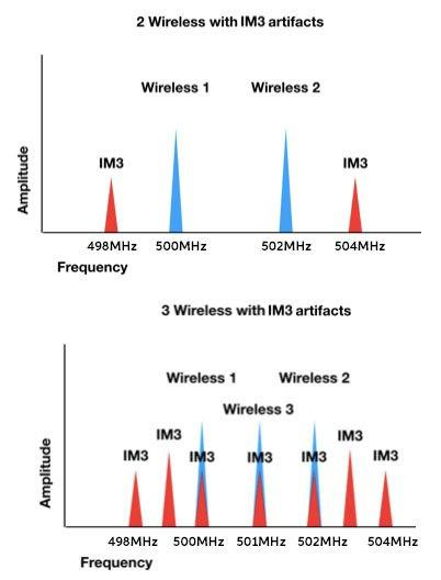 在这一半的频率中,最响亮和最接近的叫做IM3(三阶交调),这是我们应该最为关注的部分。两个无线设备会产生2个IM3失真产物,但3个无线设备会生成9个IM3失真产物。当它们中的两个落在相同的频率上(当你均匀地间隔频率时,这是很常见的)时,振幅会增加,会使它们更具破坏性。简而言之,每添加一个无线通道几乎都会使这个过程的复杂度增加一倍。