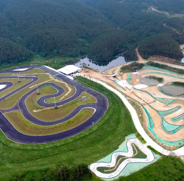 广东大河马赛车场位于恩平泉林黄金小镇内,占地面积约6万平米,赛道符合国家 A 级标准,直路路面宽12米,全长约1200米,包含12个弯位。赛道路面采用改性沥青路铺筑,两侧采用高速路边防撞栏及 4 层轮胎保护。赛场配有专业灯光、计时系统、转播系统等,适合开展各类飘移比赛、试乘试驾、车况测试、团体竞速等活动,是粤港澳大湾区近十年来最令人瞩目的赛车场地。