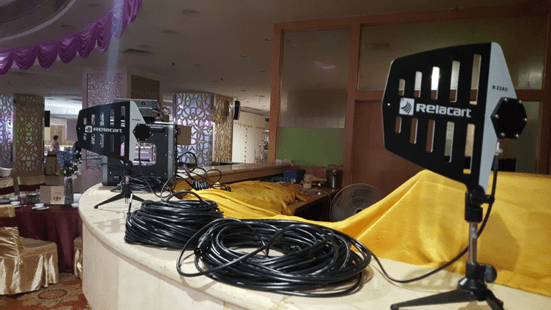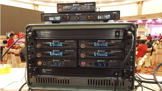 本次迎春联欢会上专业音频设备选用Relacart五套HR-31S真分集无线音频系统,配备五支手持话筒,四个腰包发射器。一套UR-223D双通道真分集无线音频系统,配备一个腰包发射器。HR-31S、UR-223D七通道叠机混用,搭配两台PM-160T UHF无线内耳监听系统,配备两台PM-160R立体声迷你接收机;配置中增设了Relacart天线分配系统,包括两台R-14D分集式天线分配系统和两个R-22AU指向性板状天线。这套音频设备增强接收信号,延长接收距离,覆盖了舞台的无信号角,提高了设备的稳定性。
