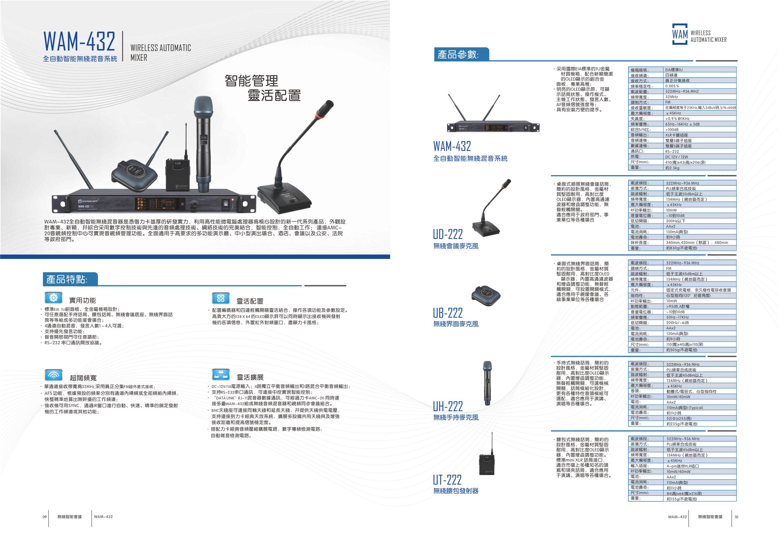 WAM-432全自动智能无线混音器是凭借力卡雄厚的研发实力,利用高性能微电脑处理器为核心设计的新一代系列产品,外观设计专业、新颖,并综合采用数字控制技术与先进的音频处理技术、网络技术结合,智能控制,全自动工作;