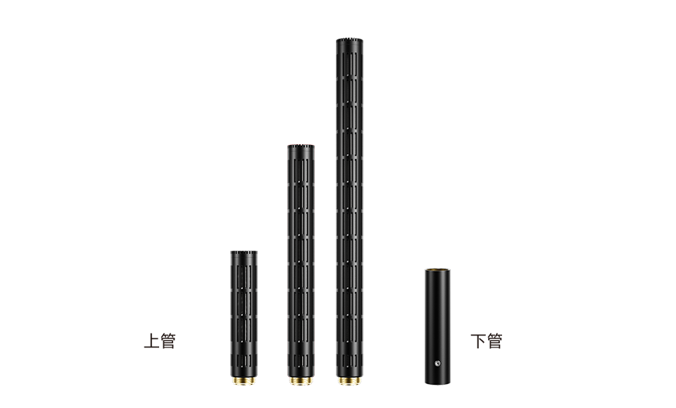 提供不同长度拾音头可自由更换,通过声干涉原理使麦克风获得不同指向性、拾音角度等,以适配各种场合录制需求。